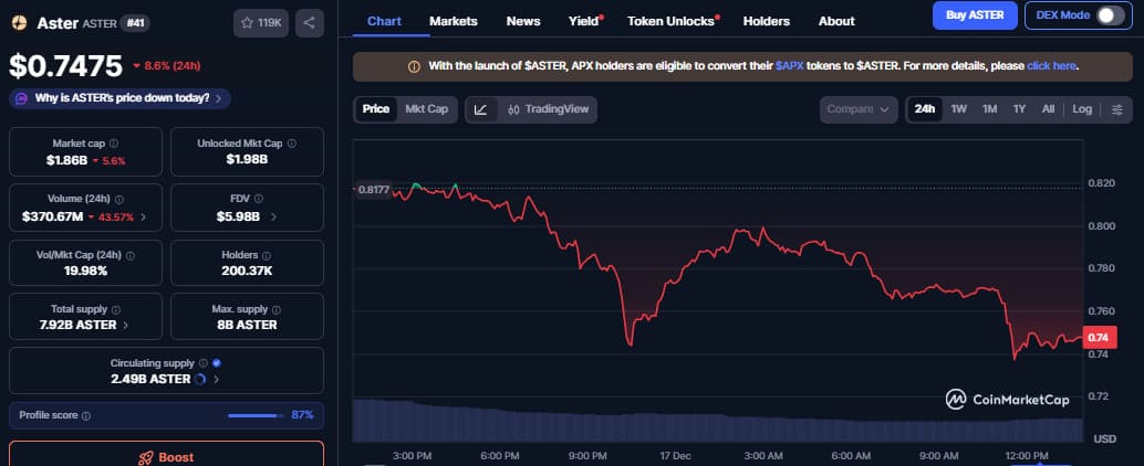 Aster’s native token is changing hands at $0.7475 after losing more than 8% of its value in the last 24 hours.