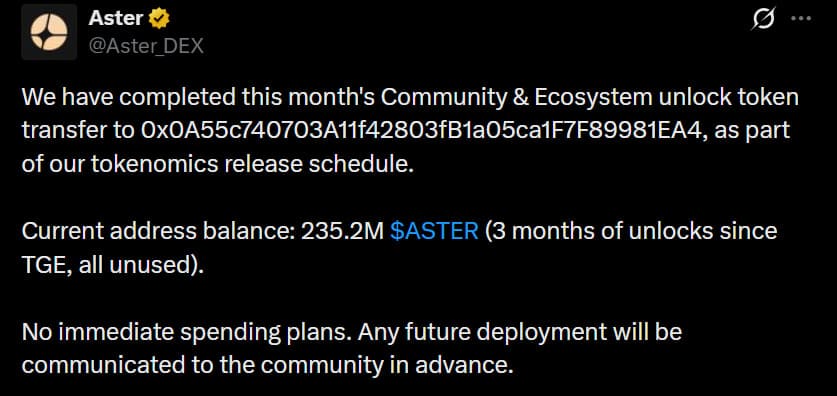 They have moved the unlocked assets to an address that now holds 235.2 million Aster coins after three months of coin releases.