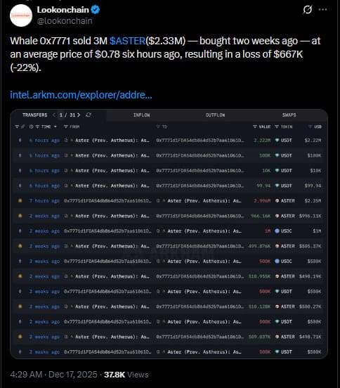 • A large-scale investor has offloaded millions of ASTER tokens, absorbing a 22% loss within two weeks.